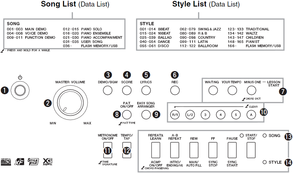 Press the start/stop button in the Style/Song panel [13/14]