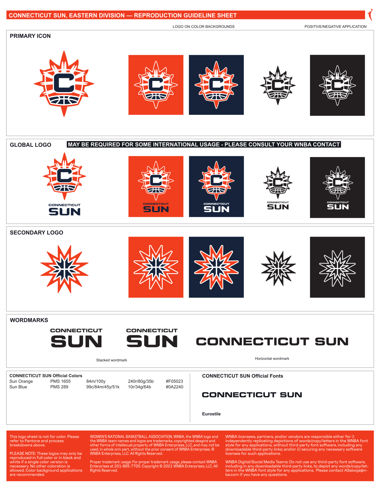 ^"Connecticut Sun Announce 20th Anniversary Season". Sun.WNBA.com. NBA Media Ventures, LLC. February 15, 2022. Retrieved September 5, 2022. Today, the Connecticut Sun announced details of our 19th Anniversary season and unveiled their 20th Anniversary logo to commemorate their two decades in Connecticut. The logo, which celebrates the franchise's platinum year, features the current Connecticut Sun logo with a 20th Anniversary demarcation and keeps the Sun's orange, blue and white color scheme.